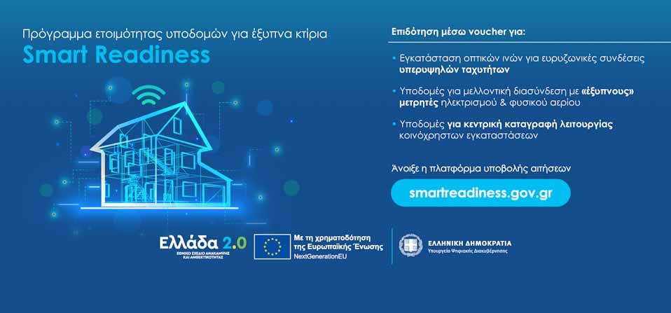 Υπενθυμίζεται ότι οι ενδιαφερόμενοι εγκαταστάτες μέσω της πλατφόρμας smartreadiness.gov.gr μπορούν να υποβάλλουν την αίτησή τους μέχρι την Δευτέρα 30 Ιουνίου 2025, για τα κτίρια που είναι επιλέξιμα στο πλαίσιο της Δράσης «Ετοιμότητα Υποδομών για Έξυπνα Κτίρια (Smart Readiness)».