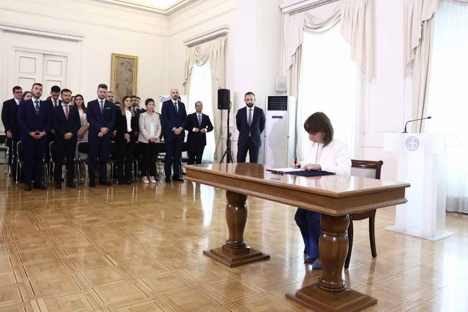 Η Πρόεδρος της Δημοκρατίας Κατερίνα Σακελλαροπούλου παρέστη νωρίτερα σήμερα, στην τελετή ορκωμοσίας και απένειμε τα διπλώματα σπουδών στους υποψήφιους Ακολούθους Πρεσβείας της ΚΖ’ Σειράς, στο Υπουργείο Εξωτερικών.