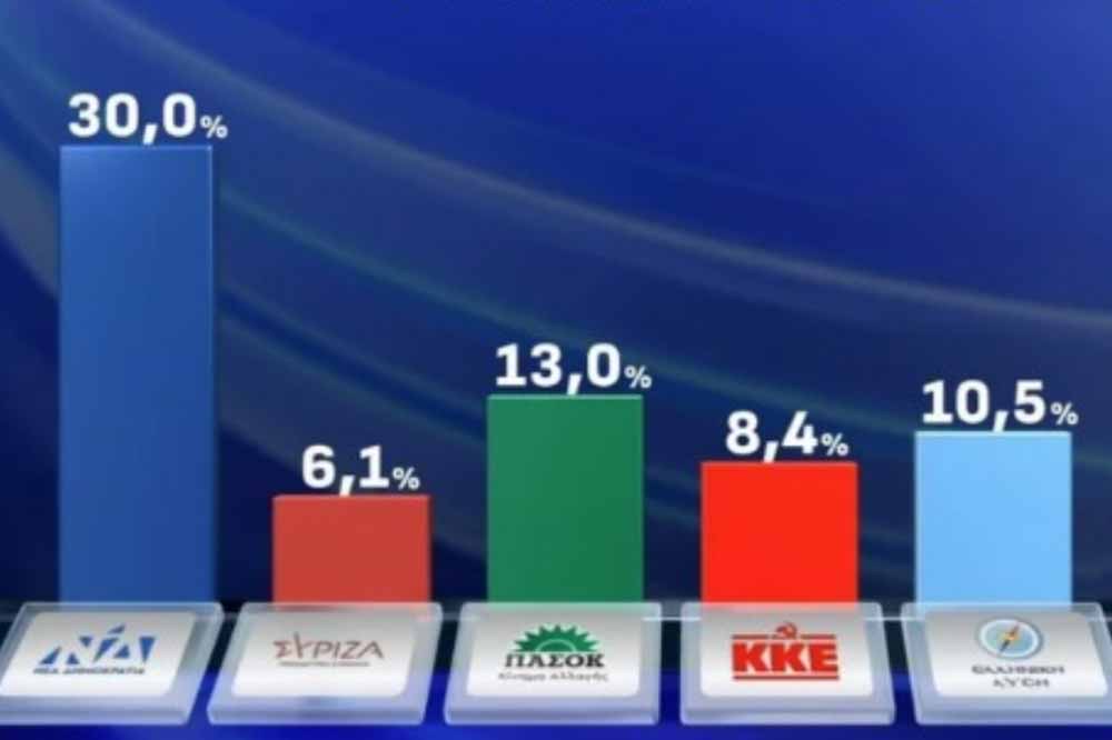 Ακολουθούν η Ελληνική Λύση με 10,5%, το ΚΚΕ με 8,4%, ο ΣΥΡΙΖΑ με 6,1%, η ΝΙΚΗ με 3,2%, η ΦΩΝΗ ΛΟΓΙΚΗΣ με 3%. Εκτός Βουλής το ΚΙΝΗΜΑ ΔΗΜΟΚΡΑΤΙΑΣ με 2,7%, το ΜέΡΑ25 με 2,6% και η ΝΕΑ ΑΡΙΣΤΕΡΑ με 1,6%. Αλλο κόμμα συγκεντρώνει 2,5%.
