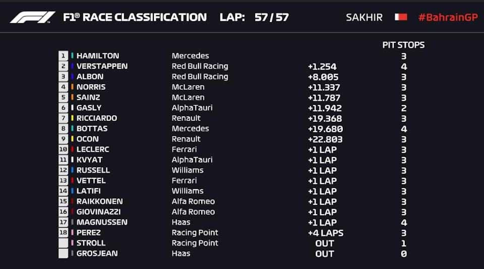Ο Χάμιλτον που είχε «σφραγίσει» την κατάκτηση του φετινού πρωταθλήματος στην Τουρκία πριν από δύο εβδομάδες, πανηγύρισε στο Σακχίρ την 95η νίκη του έχοντας ξεκινήσει από την pole position. Ήταν δε η 5η διαδοχική και 11η στα 15 συνολικά Γκραν Πρι της σεζόν μέχρι στιγμής.