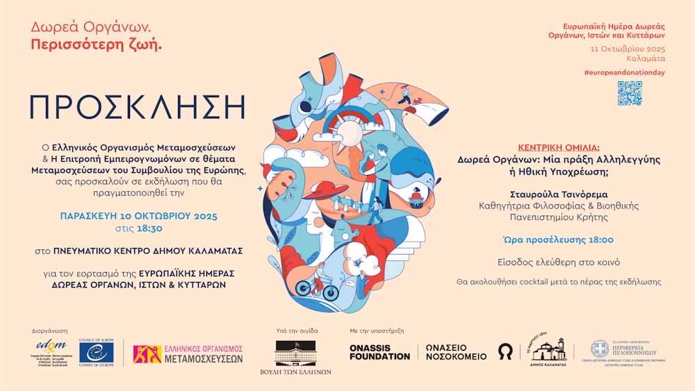 «Αγαπητές φίλες και φίλοι, Σεβασμιότατε, κύριε Πρόεδρε της Βουλής, αξιότιμοι εκπρόσωποι του Συμβουλίου της Ευρώπης, κύριε Περιφερειάρχη, κύριε Δήμαρχε, εκλεκτοί προσκεκλημένοι, κυρίες και κύριοι. Με μεγάλη χαρά και συγκίνηση βρίσκομαι σήμερα μαζί σας στην Καλαμάτα, για να τιμήσουμε την Ευρωπαϊκή Ημέρα Δωρεάς Οργάνων, Ιστών και Κυττάρων — μια ημέρα αφιερωμένη στο πιο βαθύ και ουσιαστικό μήνυμα της ανθρώπινης ύπαρξης: την προσφορά και τη ζωή.