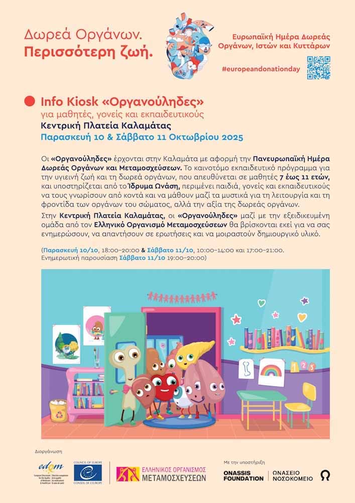 Ο Υπουργός Υγείας Άδωνις Γεωργιάδης συμμετείχε σήμερα, Παρασκευή 10 Οκτωβρίου 2025, σε εκδήλωση για την Ευρωπαϊκή Ημέρα Δωρεάς Οργάνων, Ιστών και Κυττάρων που αποτελεί μια πρωτοβουλία του Συμβουλίου της Ευρώπης και φέτος διοργανώνεται στην Καλαμάτα στις 10 και 11 Οκτωβρίου από τον Ελληνικό Οργανισμό Μεταμοσχεύσεων (Ε.Ο.Μ.), υπό την Αιγίδα της Βουλής των Ελλήνων.