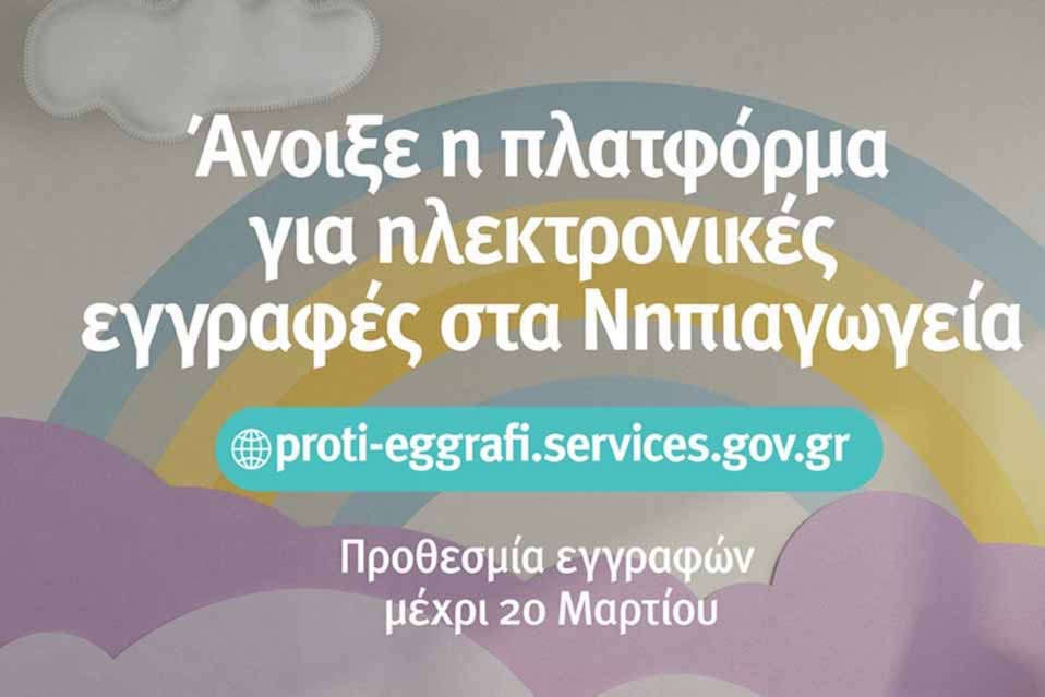 Ανοίγει από σήμερα Δευτέρα 1η Μαρτίου 2021 και έως το Σάββατο 20 Μαρτίου 2021 η ηλεκτρονική πλατφόρμα εγγραφών στα δημόσια νηπιαγωγεία για το σχολικό έτος 2021-2022, νωρίτερα από κάθε άλλη χρονιά, κατόπιν συνεργασίας των υπουργείων Παιδείας και Θρησκευμάτων και Ψηφιακής Διακυβέρνησης.