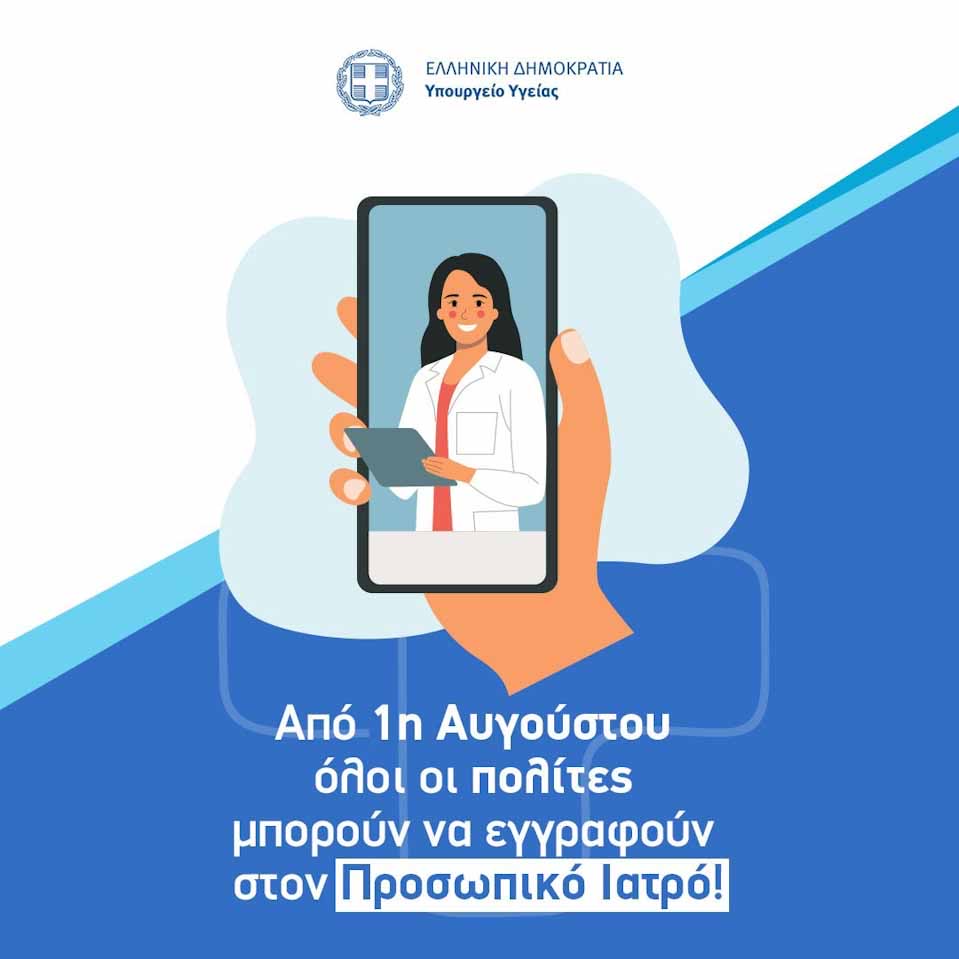 Άνοιξε σήμερα, Δευτέρα 1η Αυγούστου, το απόγευμα η πλατφόρμα https://ehealth.gov.gr/p-rv/pγια την εγγραφή των πολιτών που έχουν συμπληρώσει το 16ο έτος της ηλικίας τους στον Προσωπικό Γιατρό σε όλες τις περιφέρεις της χώρας πλην των Περιφερειών Αττικής και Νοτίου Αιγαίου.
