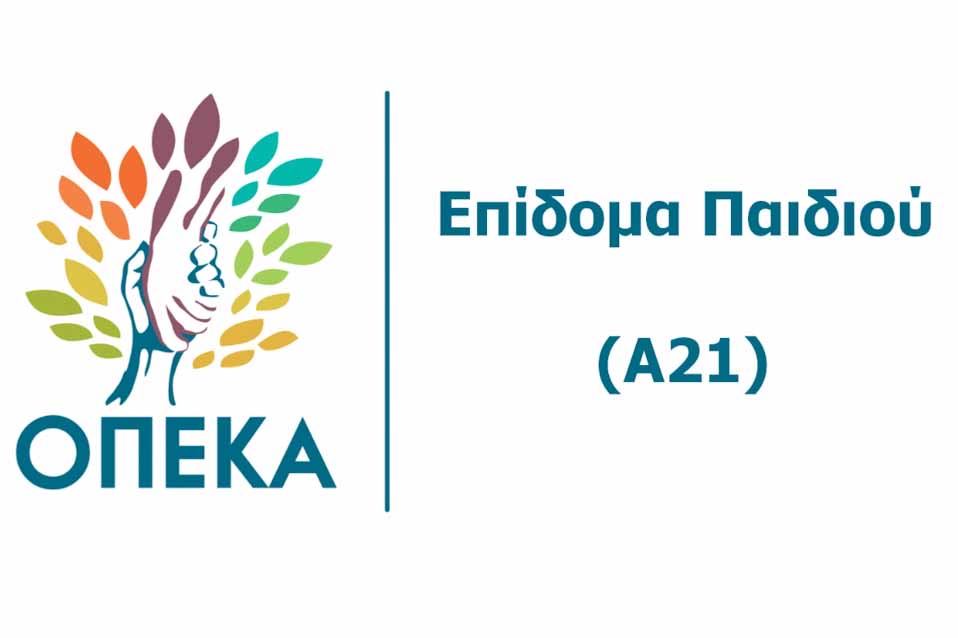 Υπουργείο Κοινωνικής Συνοχής και Οικογένειας, με τον εποπτευόμενο Οργανισμό Επιδομάτων και Κοινωνικής Αλληλεγγύης (ΟΠΕΚΑ), ενημερώνουν ότι, η ηλεκτρονική πλατφόρμα Α21 –Επίδομα Παιδιού, άνοιξε σήμερα και