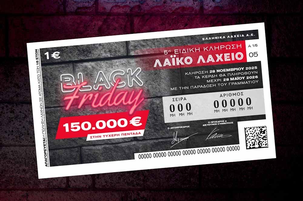 Λίγες ημέρες απομένουν για την ειδική κλήρωση Black Friday του Λαϊκού Λαχείου, με το παιχνίδι του ΟΠΑΠ να μοιράζει 150.000 ευρώ στον μεγάλο νικητή της ειδικής κλήρωσης, που θα πραγματοποιηθεί την Παρασκευή 28 Νοεμβρίου.