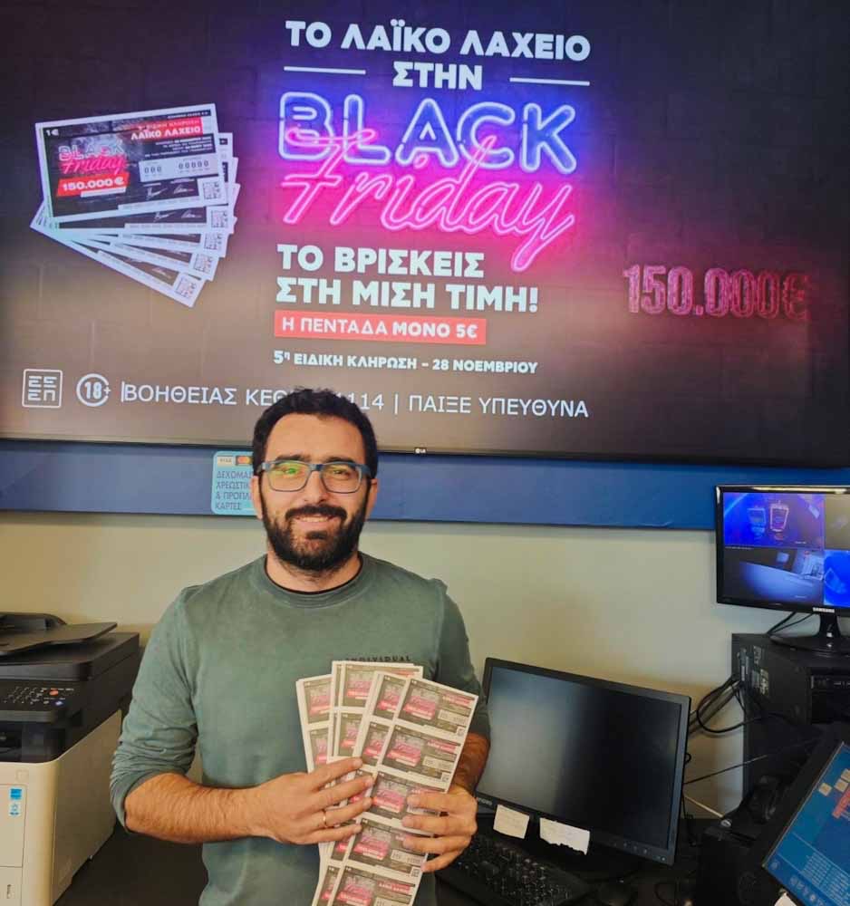 «Το Λαϊκό Λαχείο συμμετέχει για 3η συνεχόμενη χρονιά στην Black Friday, με τους παίκτες να προμηθεύονται τους λαχνούς τους στη μισή τιμή, δηλαδή με 5 ευρώ ανά πεντάδα και 1 ευρώ για κάθε λαχνό», αναφέρει ο Ιορδάνης Σιδηρόπουλος, ιδιοκτήτης καταστήματος ΟΠΑΠ στις Αχαρνές.