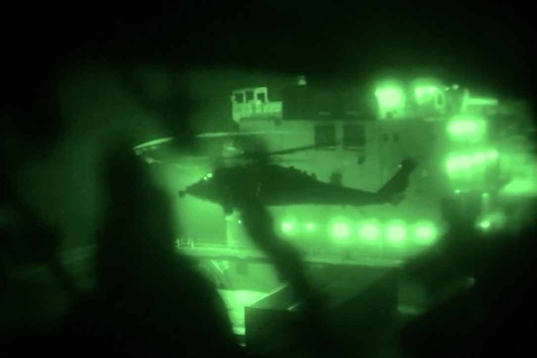Στο νέο βίντεο που έδωσε στη δημοσιότητα εμφανίζονται οι πεζοναύτες που απογειώνονται με ελικόπτερα από το αποβατικό πλοίο USS Tripoli (LHA-7) και κινούνται πάνω από την Αραβική Θάλασσα για να επιβιβαστούν και να καταλάβουν το εμπορικό πλοίο M/V Touska.