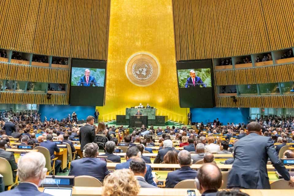 Στην ομιλία του, ο γενικός γραμματέας συνόψισε ως «αβίωτη» την κατάσταση του κόσμου σήμερα, αλλά επέμεινε ότι τα προβλήματα θα μπορούσαν να επιλυθούν. «Οι γεωπολιτικές διαιρέσεις βαθαίνουν. Ο πλανήτης συνεχίζει να θερμαίνεται. Οι πόλεμοι μαίνονται, χωρίς να υπάρχει κάποια ένδειξη για το πώς θα τελειώσουν. Και τα πυρηνικά δόγματα και τα νέα όπλα ρίχνουν βαριά σκιά. Οδεύουμε προς το αδιανόητο – μια πυριτιδαποθήκη που υπάρχει κίνδυνος να καταποντίσει τον κόσμο», είπε.