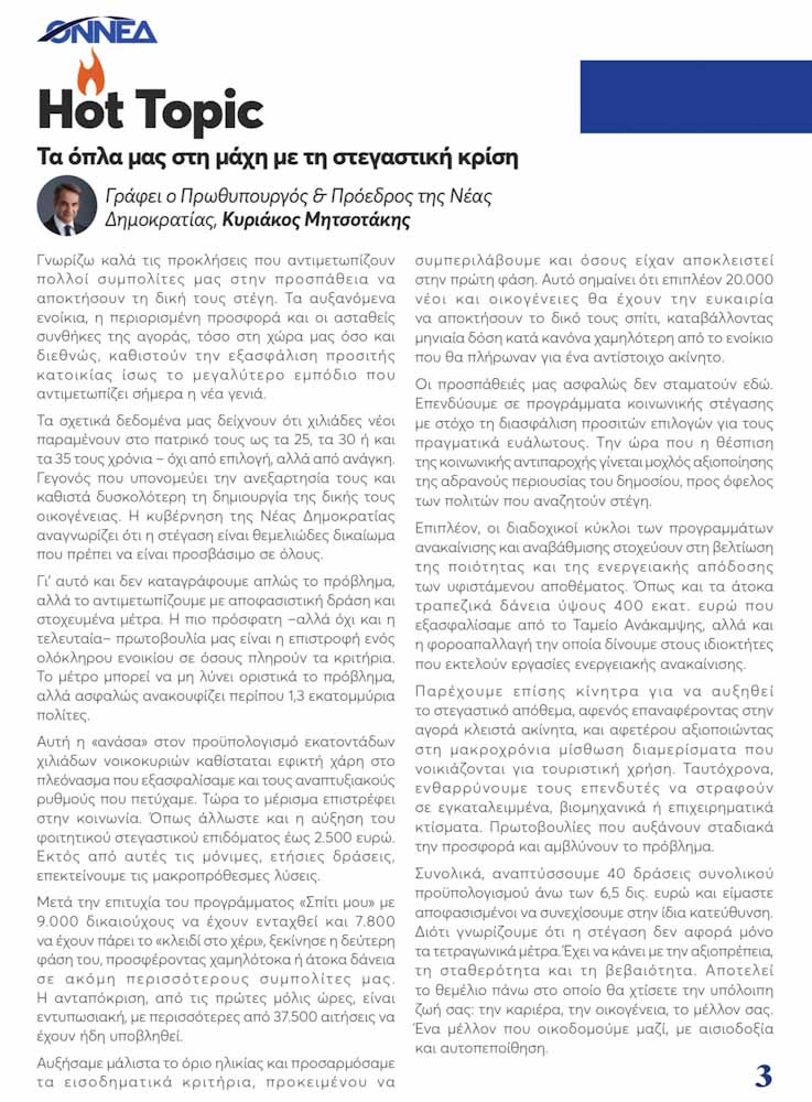 «Γνωρίζω καλά τις προκλήσεις που αντιμετωπίζουν πολλοί συμπολίτες μας στην προσπάθεια να αποκτήσουν τη δική τους στέγη. Τα αυξανόμενα ενοίκια, η περιορισμένη προσφορά και οι ασταθείς συνθήκες της αγοράς, τόσο στη χώρα μας όσο και διεθνώς, καθιστούν την εξασφάλιση προσιτής κατοικίας ίσως το μεγαλύτερο εμπόδιο που αντιμετωπίζει σήμερα η νέα γενιά» γράφει στην εισαγωγή του σε άρθρο του ο πρωθυπουργός Κυριάκος Μητσοτάκης, στο δεύτερο τεύχος του ηλεκτρονικού περιοδικούτης ΟΝΝΕΔ με το όνομα “Onside”.