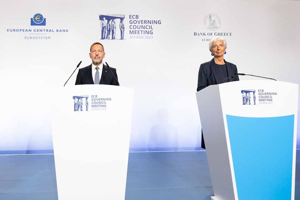 Οι διοικητές των εθνικών κεντρικών τραπεζών των χωρών της ζώνης του ευρώ και τα έξι μέλη της Εκτελεστικής Επιτροπής της ΕΚΤ συνεδρίασαν στο κεντρικό κτίριο της Τράπεζας της Ελλάδος και αποφάσισαν να πατήσουν «φρένο» έπειτα από δέκα διαδοχικές συνεδριάσεις στις οποίες αποφάσιζαν αύξηση των επιτοκίων.