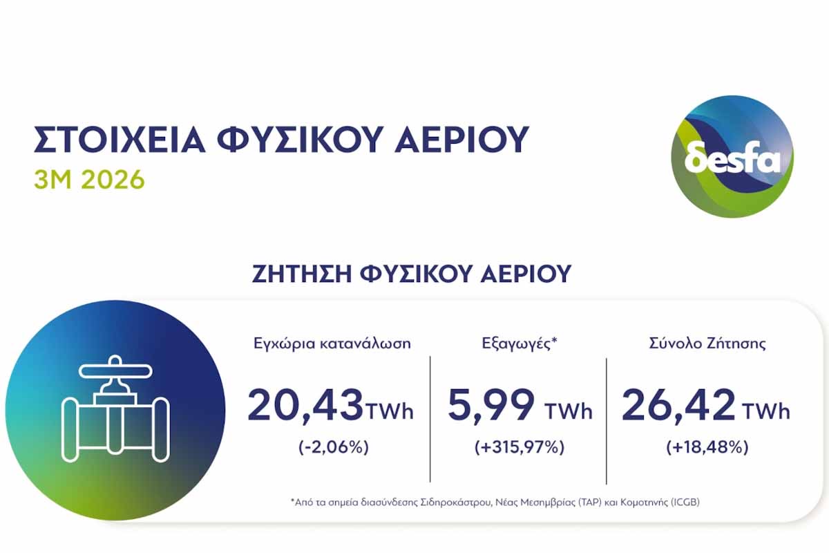 Στις 26,42 TWh διαμορφώθηκε η συνολική ζήτηση φυσικού αερίου στην Ελλάδα κατά το πρώτο τρίμηνο του 2026, καταγράφοντας αύξηση 18,5% σε σύγκριση με το αντίστοιχο τρίμηνο του 2025 (22,30 TWh). Η εξέλιξη αυτή οφείλεται κυρίως στην έντονη αύξηση των εξαγωγών φυσικού αερίου, οι οποίες σχεδόν τετραπλασιάστηκαν σε ετήσια βάση, φθάνοντας τις 5,99 TWh έναντι 1,44 TWh την αντίστοιχη περίοδο του 2025. Η τάση αυτή υπογραμμίζει τον ενισχυόμενο ρόλο της Ελλάδας ως περιφερειακού κόμβου φυσικού αερίου για τη Νοτιοανατολική Ευρώπη.