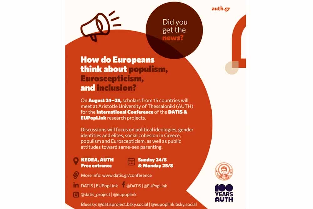 Τα αποτελέσματα των ερευνητικών προγραμμάτων του ΑΠΘ, DATIS και EUPopLink, θα παρουσιαστούν σε διήμερο Διεθνές Συνέδριο, στις 24 και 25 Αυγούστου 2025, στο ΚΕΔΕΑ του ΑΠΘ.
