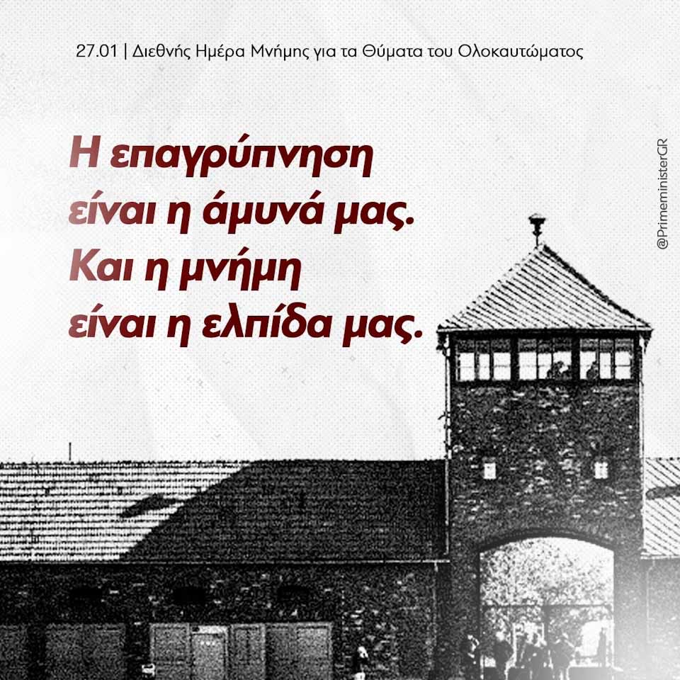 «H Διεθνής Ημέρα Μνήμης των Θυμάτων του Ολοκαυτώματος γίνεται και φέτος αφορμή σκέψης, αλλά και εντολή εγρήγορσης. Πολύ περισσότερο όταν στην εποχή μας ισχυρές φωνές επιχειρούν να αλλοιώσουν την αλήθεια και να αναζωπυρώσουν το μίσος στο όνομα των πρόσκαιρων συμφερόντων τους. Όμως η ιστορική γνώση, οι δημοκρατικές κατακτήσεις και οι αξίες του πολιτισμού μας είναι τα δικά μας όπλα.