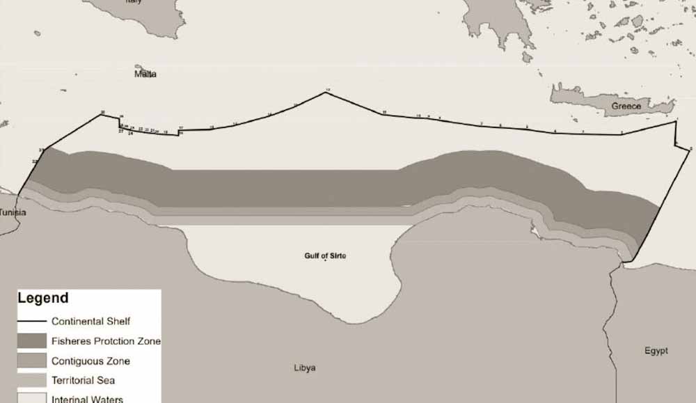 Παραθέτοντας συντεταγμένες και χάρτη, η Λιβύη περιγράφει λεπτομερώς τη χάραξη της υφαλοκρηπίδας της, από τα σημεία Β και Α στα ανατολικά (οριοθετημένα με την Τουρκία βάσει του Μνημονίου του 2019), έως τα σημεία οριοθέτησης με την Ιταλία (συμπεριλαμβάνοντας πάντως το νησί της Σικελιάς), τη Μάλτα και την Τυνησία, στηριζόμενη σε αποφάσεις του Διεθνούς Δικαστηρίου το 1982 και 1985.