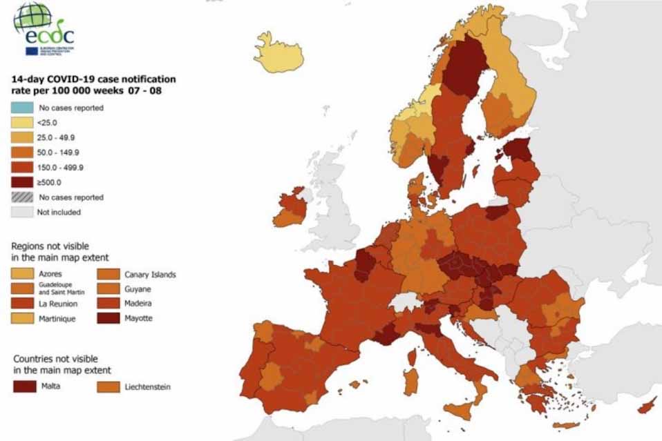 Την ίδια ώρα, το μεγαλύτερο κομμάτι της Ευρώπης όπως φαίνεται και στον παρακάτω χάρτη βρίσκεται στην πορτοκαλί ζώνη που σημαίνει πως έχουν 150 ή περισσότερα κρούσματα ανά 100.000 κατοίκους. Όσες περιοχές έχουν βαφτεί με σκούρο κόκκινο χρώμα τότε έχουν 500 ή περισσότερα κρούσματα στον ίδιο πληθυσμό.