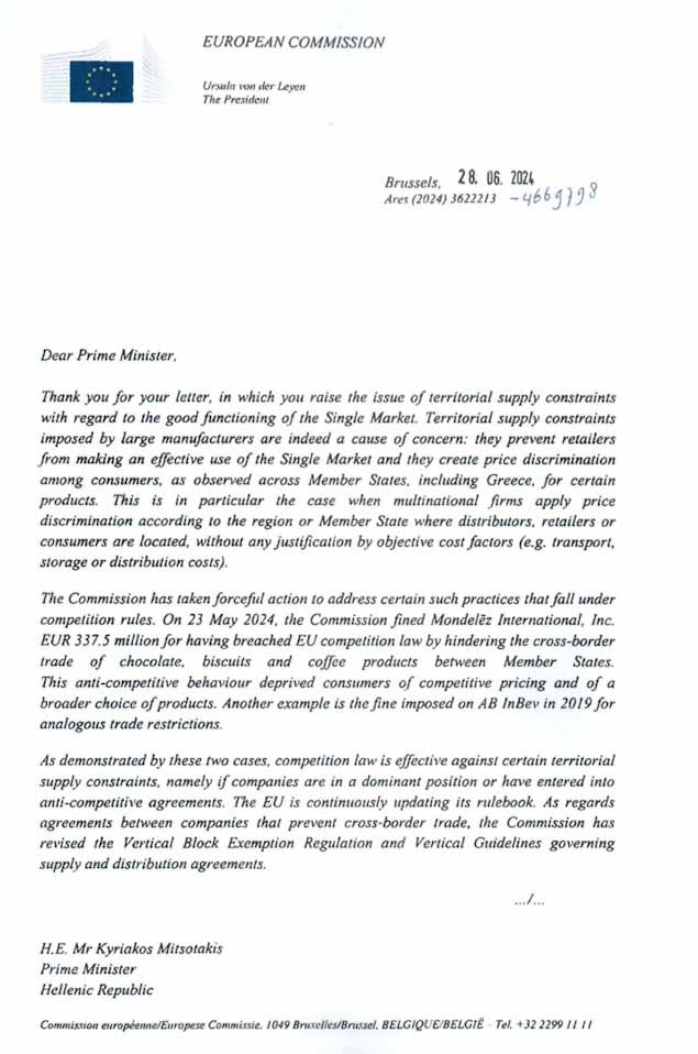 Συγκεκριμένα, ερευνητική διαδικασία για τις αθέμιτες πρακτικές πολυεθνικών εταιρειών, τις οποίες είχε καταγγείλει ο κ. Μητσοτάκης, που έχουν ως συνέπεια πανομοιότυπα ή παραπλήσια προϊόντα να πωλούνται σε διαφορετικές τιμές εντός της ΕΕ, εκκινεί η Ευρωπαϊκή Επιτροπή, όπως αναφέρει σε επιστολή της προς τον πρωθυπουργό η πρόεδρος της Ευρωπαϊκής Επιτροπής.