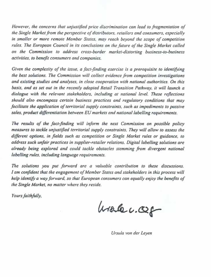 Η κ. φον ντερ Λάιεν ευχαριστεί τον κ. Μητσοτάκη για τη «πολύτιμη συνεισφορά» του και για τις λύσεις που πρότεινε στην επιστολή του, εκφράζοντας την αυτοπεποίθηση ότι η ερευνητική διαδικασία θα προσδιορίσει τα επόμενα βήματα ώστε όλοι οι ευρωπαίοι πολίτες «να απολαμβάνουν ισότιμα τα οφέλη της ενιαίας αγοράς, όπου κι αν κατοικούν».
