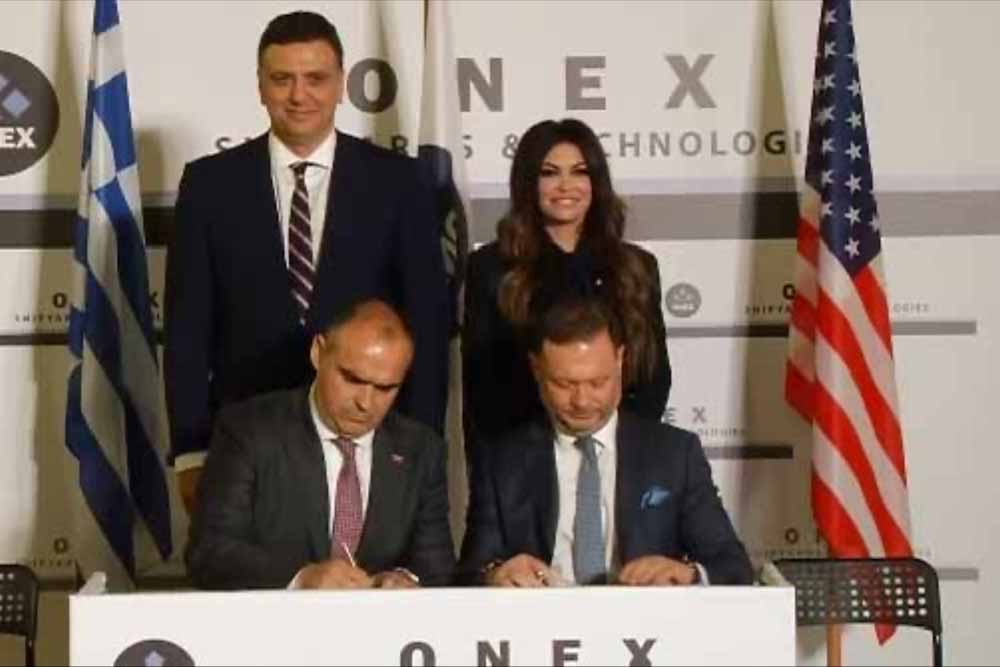 Φωτογραφία: Την συμφωνία υπέγραψαν ο Πρόεδρος και Διευθύνων Σύμβουλος της ONEX, Πάνος Ξενοκώστας και ο Διευθυντής της Megatugs Salvage & Towage, Παύλος Μ. Ξηραδάκης, παρουσία του υπουργού Ναυτιλίας, Βασίλη Κικίλια και της Πρέσβειρας των Ηνωμένων Πολιτειών της Αμερικής στην Ελλάδα, Κίμπερλι Γκίλφοϊλ.
