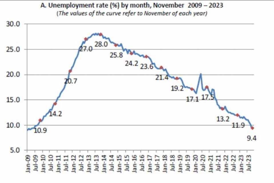 Στο 9,4% διαμορφώθηκε το εποχικά διορθωμένο ποσοστό ανεργίας τον Νοέμβριο του 2023, έναντι του αναθεωρημένου προς τα άνω 11,9% τον Νοέμβριο του 2022 και του αναθεωρημένου προς τα κάτω 9,4% τον Οκτώβριο του 2023, σύμφωνα με τα στοιχεία της Ελληνικής Στατιστικής Αρχής (ΕΛΣΤΑΤ).
