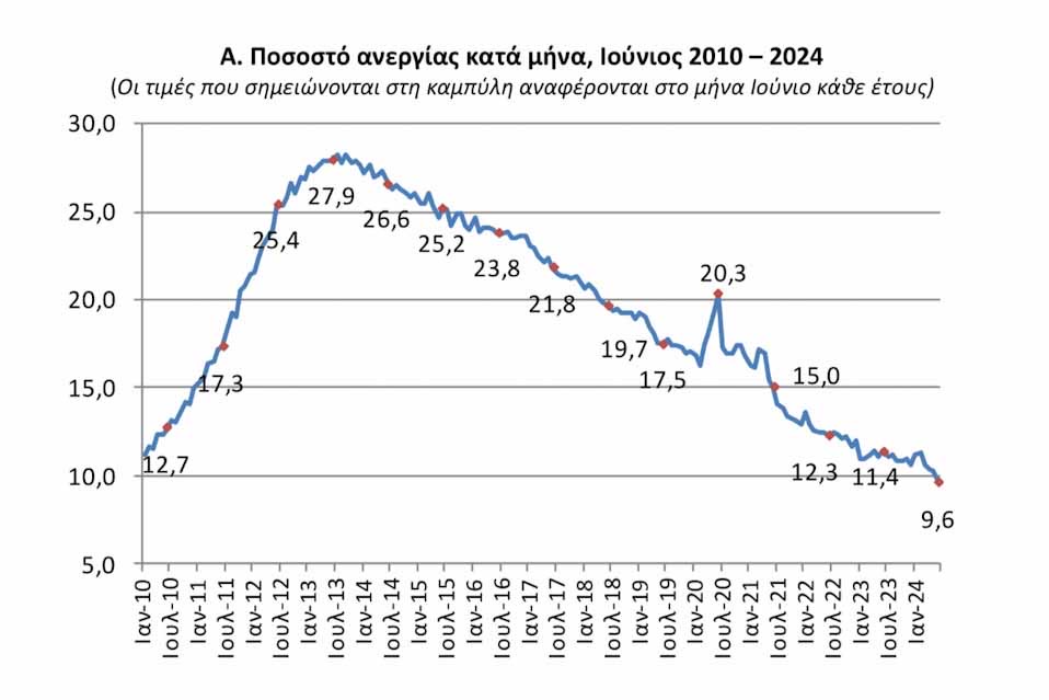 Στο 9,6% μειώθηκε το εποχικό ποσοστό της ανεργίας στη χώρα τον Ιούνιο εφέτος, έναντι του αναθεωρημένου προς τα άνω 11,4% τον Ιούνιο 2023 και του αναθεωρημένου προς τα κάτω 10,3% τον Μάιο 2024. Οι άνεργοι ανήλθαν σε 456.663 άτομα, σημειώνοντας μείωση κατά 85.865 άτομα σε σχέση με τον Ιούνιο 2023 (15,8%) και κατά 30.629 άτομα σε σχέση με τον Μάιο 2024 (6,3%).