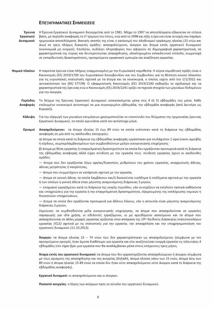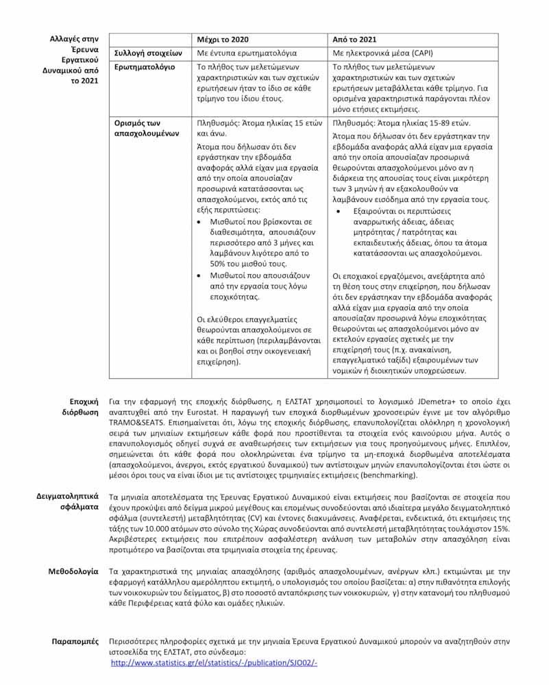 Στο Γράφημα 1 παρουσιάζεται η εξέλιξη των παραπάνω μεγεθών από τον Απρίλιο του 2011. Βάσει της μεθοδολογίας της Έρευνας Εργατικού Δυναμικού που εφαρμόζεται και προκειμένου να διατηρείται η ποιότητα και αντιπροσωπευτικότητα των αποτελεσμάτων της Έρευνας σε ευθυγράμμιση με τον δειγματοληπτικό σχεδιασμό, τα μηνιαία στοιχεία επικαιροποιούνται με ενσωμάτωση νέων μονάδων, αμέσως μόλις οριστικοποιούνται τα αντίστοιχα στοιχεία για όλο το τρίμηνο ώστε να υπάρχει 100% κάλυψη του δείγματος. Το δείγμα νοικοκυριών και ατόμων της Έρευνας Εργατικού Δυναμικού βρίσκεται σε διαδικασία επαναβαθμονόμησης σε συνάρτηση με τα τελικά αναλυτικά δεδομένα της Απογραφής Πληθυσμού 2021.