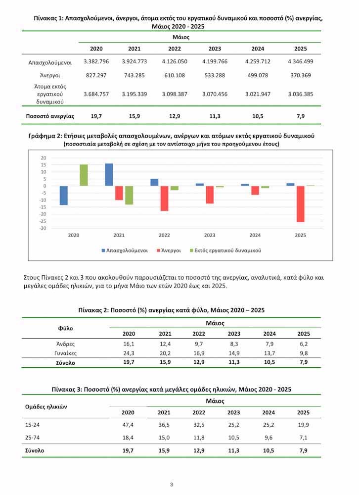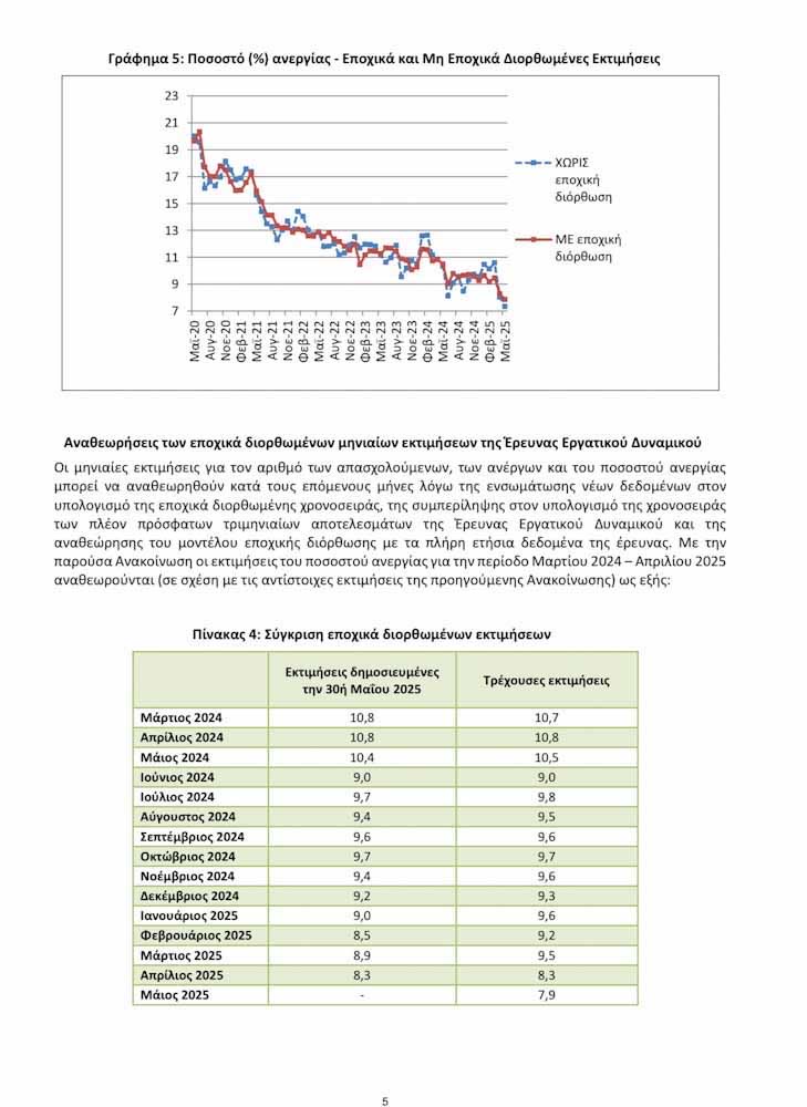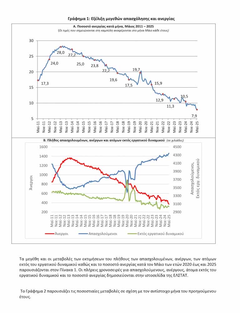 • Το εποχικά διορθωμένο ποσοστό ανεργίας τον Μάιο του 2025 ανήλθε σε 7,9% έναντι του