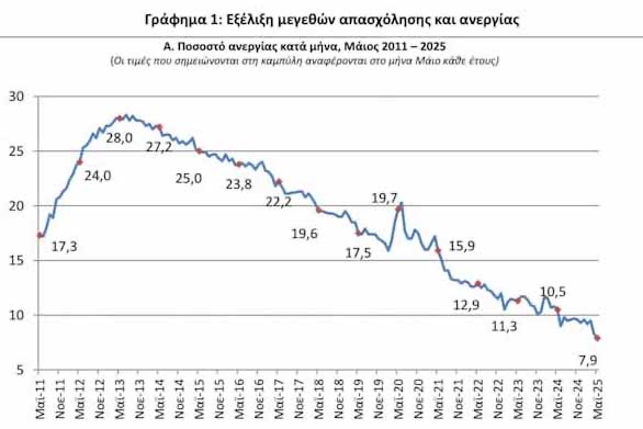 • Το εποχικά διορθωμένο ποσοστό ανεργίας τον Μάιο του 2025 ανήλθε σε 7,9% έναντι του