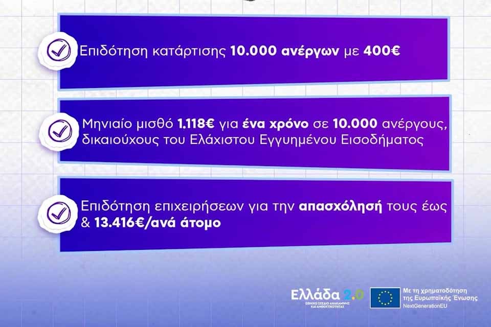 Σοφία Ζαχαράκη: Διπλή επιδότηση με 400 ευρώ άπαξ για κατάρτιση και μηνιαίο μισθό 1.118 ευρώ για ένα χρόνο σε 10.000 ανέργους, δικαιούχους του Ελάχιστου Εγγυημένου Εισοδήματος – Επιχορήγηση έως και 13.416 ευρώ ανά εργαζόμενο για 12 μήνες στις επιχειρήσεις με κάλυψη του μισθολογικού και μη μισθολογικού κόστους