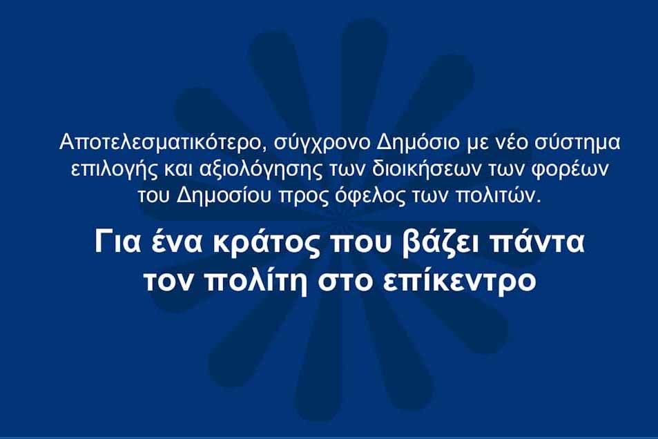 Πρόκειται για νομοσχέδιο με το οποίο θεσμοθετείται ένα νέο, ευέλικτο και πιο στοχευμένο σύστημα επιλογής και αξιολόγησης των διοικήσεων των φορέων του Δημοσίου Τομέα. Το νομοσχέδιο αφορά περισσότερες από 600 θέσεις Προέδρων, Αντιπροέδρων, Διοικητών, Αναπληρωτών Διοικητών, Υποδιοικητών, Διευθύνοντων και Εντεταλμένων Συμβούλων σε φορείς του Δημοσίου Τομέα (Νομικά Πρόσωπα Δημοσίου Δικαίου και Νομικά Πρόσωπα Ιδιωτικού Δικαίου για τα οποία η επιλογή των διοικήσεων ανήκει στην Κυβέρνηση). Συμπεριλαμβάνονται: