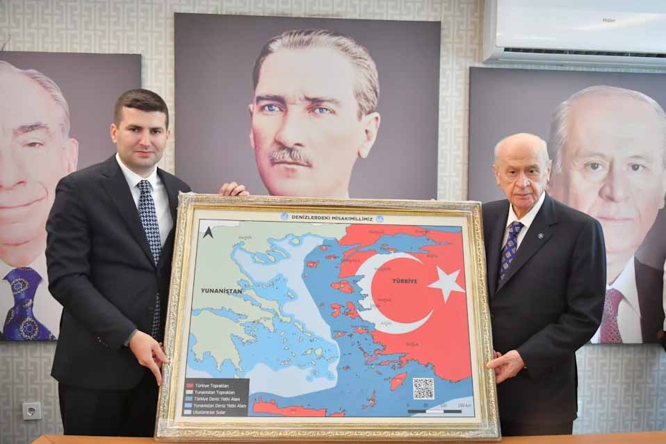 Ο κυβερνητικός εταίρος του Τούρκου προέδρου Ρετζέπ Ταγίπ Ερντογάν, Ντεβλέτ Μπαχτσελί επισκέφθηκε την έδρα της εθνικιστικής οργάνωσης «Γκρίζοι Λύκοι» και φωτογραφήθηκε δίπλα σε χάρτη ο οποίος εμφάνιζε το μισό Αιγαίο και την Κρήτη να ανήκουν στην Τουρκία.