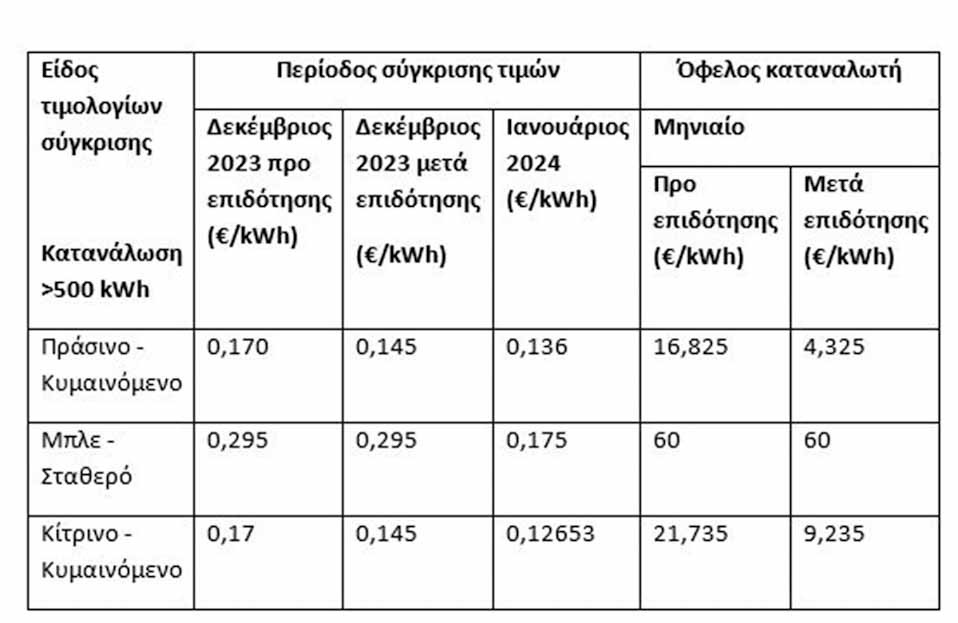 -Στο κίτρινο τιμολόγιο η τιμή χρέωσης για κατανάλωση κάτω των 500 kWh διαμορφώνεται σε 0,12653 ευρώ/kWh. Στο αντίστοιχο κυμαινόμενο τιμολόγιο, τον Δεκέμβριο του 2023, οι τιμές ήταν 0,17 ευρώ/kWh και 0,145 ευρώ/kWh (προ και μετά επιδότησης). Είναι πιο οικονομικό, δηλαδή, το κίτρινο τιμολόγιο κατά 0,04347 ευρώ (προ επιδότησης) και κατά 0,01847 ευρώ (μετά επιδότησης). Συνεπώς, το μηνιαίο κέρδος για τον καταναλωτή διαμορφώνεται σε 21,735 ευρώ και 9,235 ευρώ (προ και μετά επιδότησης) και το ετήσιο (αν διατηρηθούν αυτές οι διαφορές) σε 260,82 ευρώ και 110,82 ευρώ (προ και μετά επιδότησης), αντιστοίχως, για κατανάλωση 500 kWh τον μήνα.