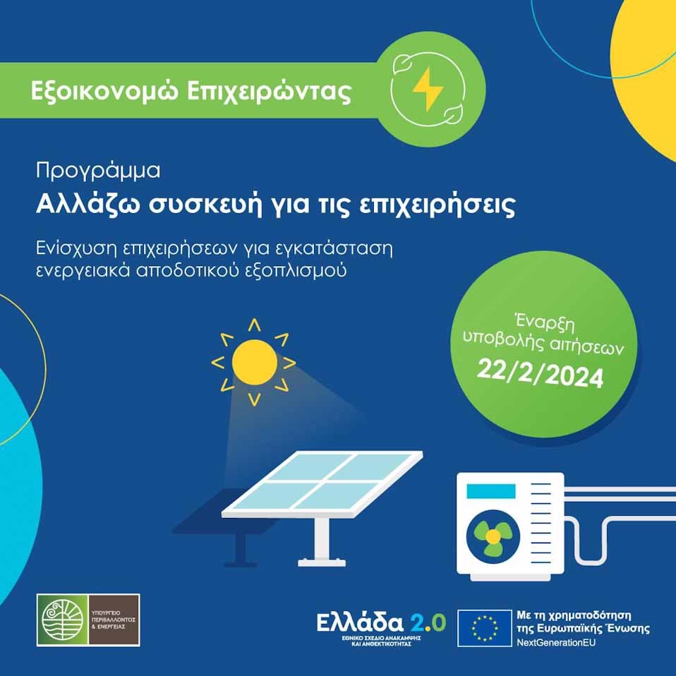 Έως τις 15 Απριλίου 2024, στις 18:00 μπορούν να υποβάλλουν τις αιτήσεις τους οι ενδιαφερόμενοι για ένταξη στο πρόγραμμα: «Αλλάζω συσκευή για τις επιχειρήσεις» του Υπουργείου Περιβάλλοντος και Ενέργειας, συνολικού ύψους 105,6 εκατ. ευρώ.