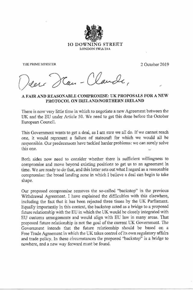 Η πρόταση πέντε σημείων, που θα έβγαζε τη Βρετανία, συμπεριλαμβανομένης και της Βόρειας Ιρλανδίας από την τελωνειακή Ένωση, ο Μπόρις Τζόνσον σημειώνει ότι υπάρχει «πολύ λίγος χρόνος» για να επιτευχθεί συμφωνία για το Brexit.