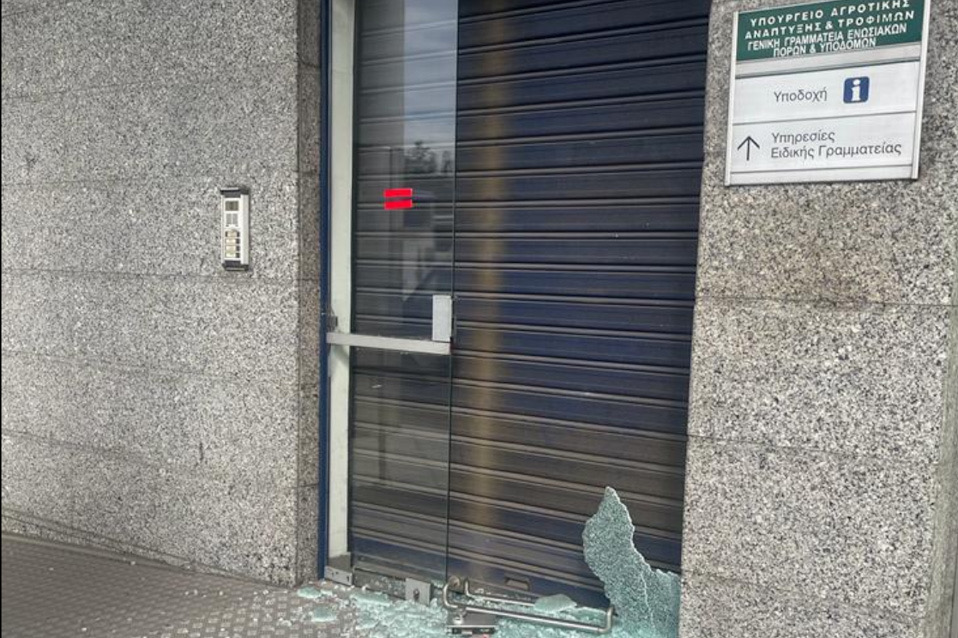Στόχος ομάδας αναρχικών έγινε η Γενική Γραμματεία Ενωσιακών Πόρων και Υποδομών του Υπουργείου Αγροτικής Ανάπτυξης και Τροφίμων, λίγο μετά το μεσημέρι.