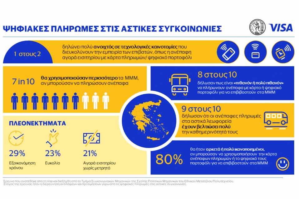 Η έρευνα με τίτλο «Ψηφιακές πληρωμές στις αστικές συγκοινωνίες» για λογαριασμό της Visa και διενεργήθηκε από τον Τομέα Μεταφορών και Συγκοινωνιακής Υποδομής ΕΜΠ τον Μάρτιο του 2024 με στόχο της διερεύνηση της αποδοχής και των προτιμήσεων των επιβατών των ΜΜΜ σχετικά με τις ψηφιακές πληρωμές στα ΜΜΜ σε Αθήνα, Θεσσαλονίκη και 11 πόλεις στην ηπειρωτική και νησιωτική Ελλάδα. Η έρευνα χρησιμοποίησε αντιπροσωπευτικό δείγμα, λαμβάνοντας υπόψη την ηλικία, το φύλο, την εκπαίδευση και άλλα δημογραφικά χαρακτηριστικά. Στη συνέχεια, πραγματοποιήθηκε ανάλυση δεδομένων και αναπτύχθηκαν στατιστικά μοντέλα (διωνυμική λογιστική παλινδρόμηση) για τη διερεύνηση αποδοχής της νέας προτεινόμενης λύσης αλλά και τον εντοπισμό παραγόντων επιρροής των μετακινουμένων, όπως την εξοικονόμηση χρόνου, την άνεση, τις απόψεις, τις συνήθειες και τα δημογραφικά χαρακτηριστικά των ερωτηθέντων.