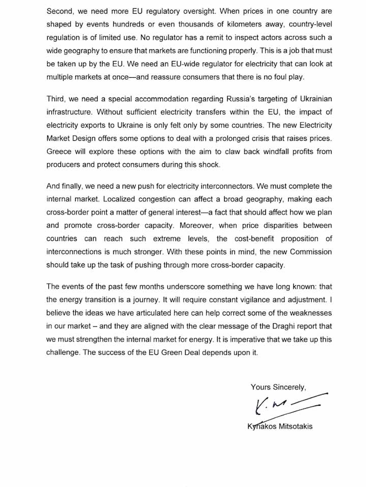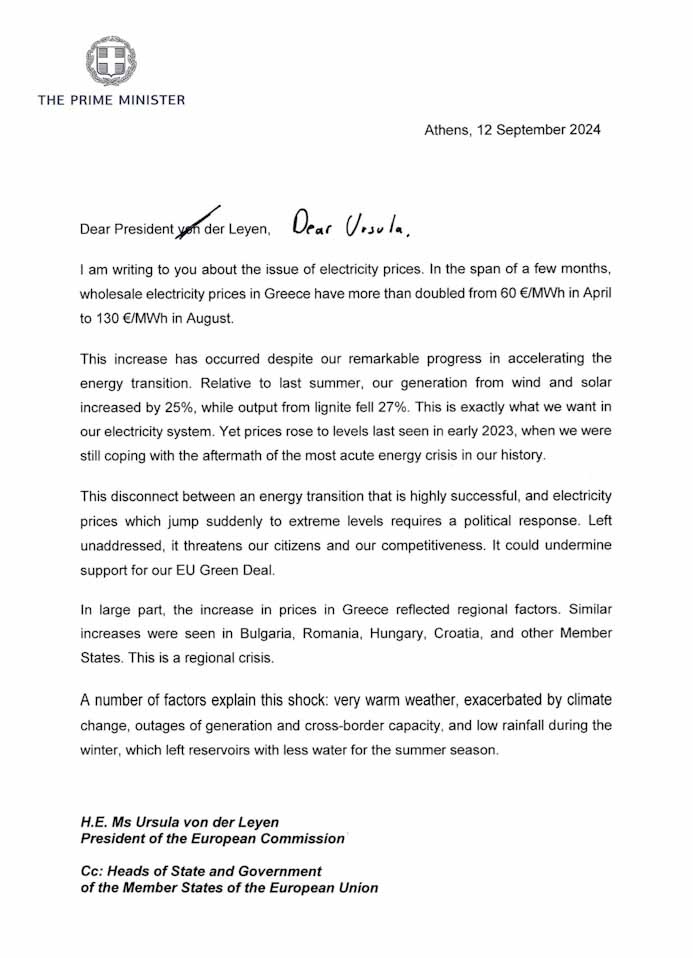 Η Επιστολή του Πρωθυπουργού Κυριάκου Μητσοτάκη προς την Πρόεδρο της Ευρωπαϊκής Επιτροπής Ursula von der Leyen σχετικά με την αγορά ενέργειας της ΕΕ