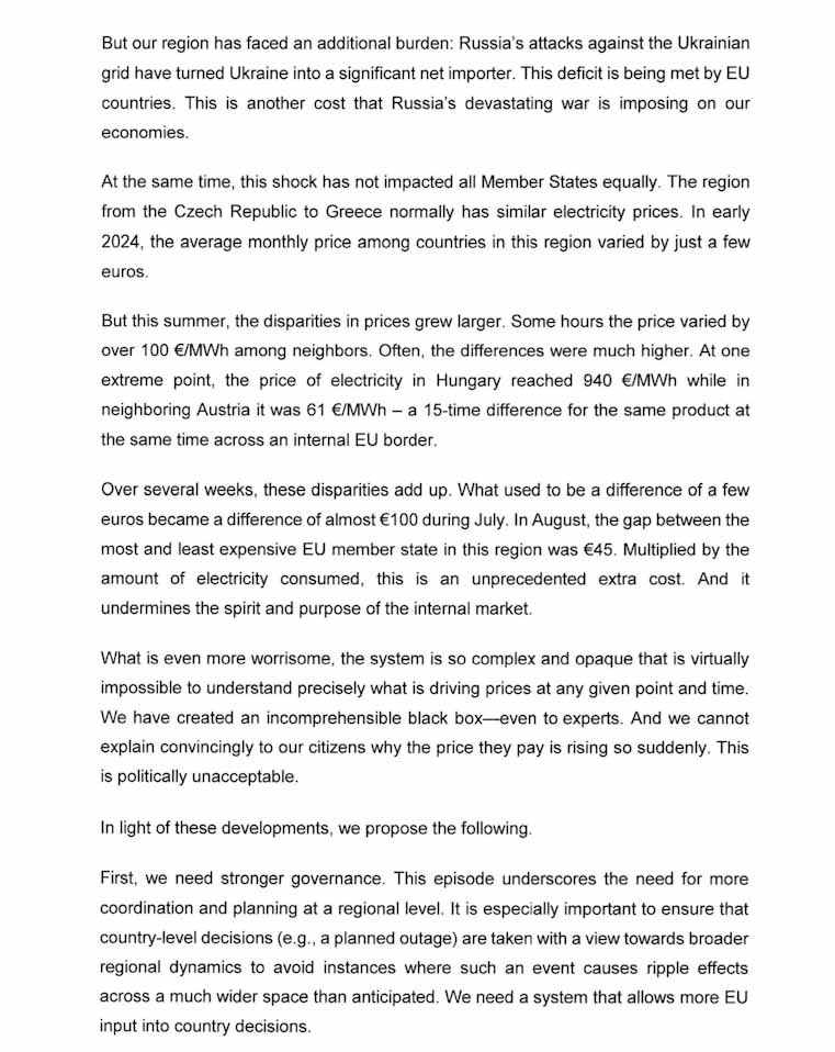 Συγκεκριμένα, ο Κυρ. Μητσοτάκης ζητά από την ΕΕ να αναλάβει δράση για την αύξηση των δυνατοτήτων διασυνοριακής μεταφοράς ενέργειας, δηλαδή την ενίσχυση των διασυνδέσεων ανάμεσα στα κράτη-μέλη, ενώ τονίζει τη σημασία της καλύτερης εποπτείας της ευρωπαϊκής αγοράς, την οποία χαρακτηρίζει «μαύρο κουτί» που είναι «ακατανόητο ακόμα και για ειδικούς».
