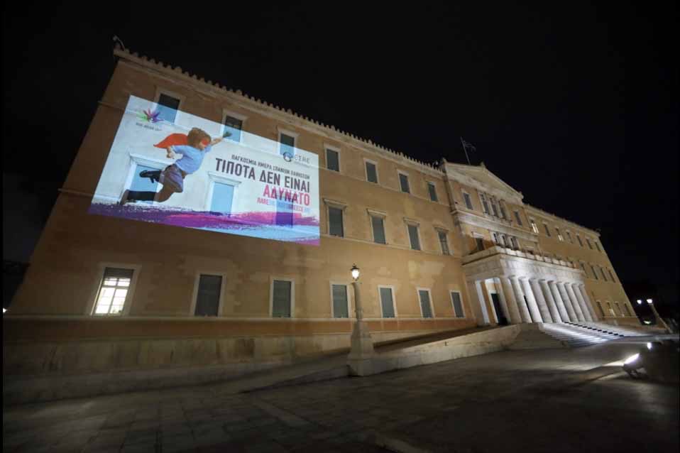 Tην Παγκόσμια Ημέρα Σπανίων Παθήσεων τίμησε η Βουλή των Ελλήνων με τη φωταγώγηση του κτιρίου του Ελληνικού Κοινοβουλίου με το σύμβολο της Διοργάνωσης από το σωματείο «95′, Ελληνική Συμμαχία για τους Σπάνιους Ασθενείς» και το λογότυπό του.