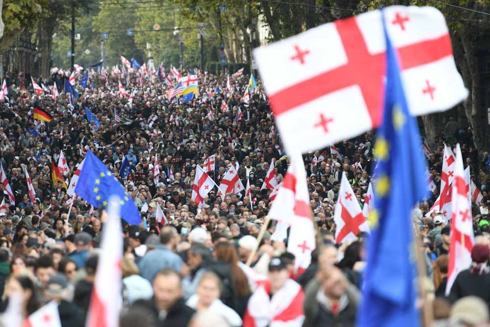 Αργά το απόγευμα, το πλήθος, κρατώντας σημαίες της Γεωργίας και της ΕΕ, βρισκόταν στο κέντρο της πόλης.