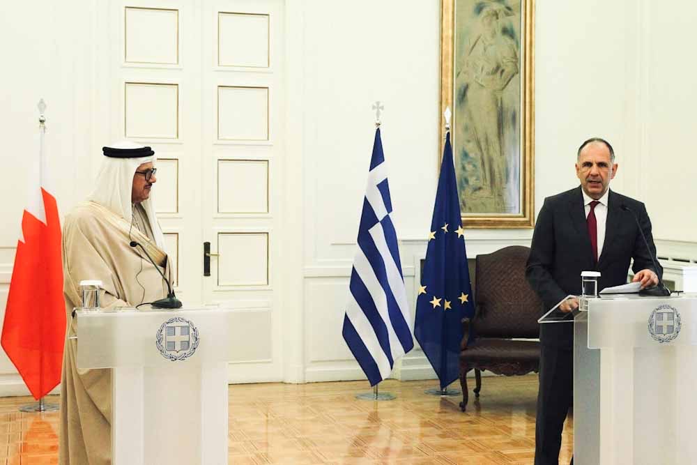 Γιώργος Γεραπετρίτης: Με ιδιαίτερη χαρά και τιμή καλωσορίζω σήμερα στην Αθήνα τον Υπουργό Εξωτερικών του Βασιλείου του Μπαχρέιν, Δρ. Abdullatif bin Rashid Alzayani. Έναν εξαίρετο και ιδιαίτερα επιδραστικό πολιτικό όχι μόνο στην περιοχή του Κόλπου, αλλά και στο διεθνές στερέωμα.