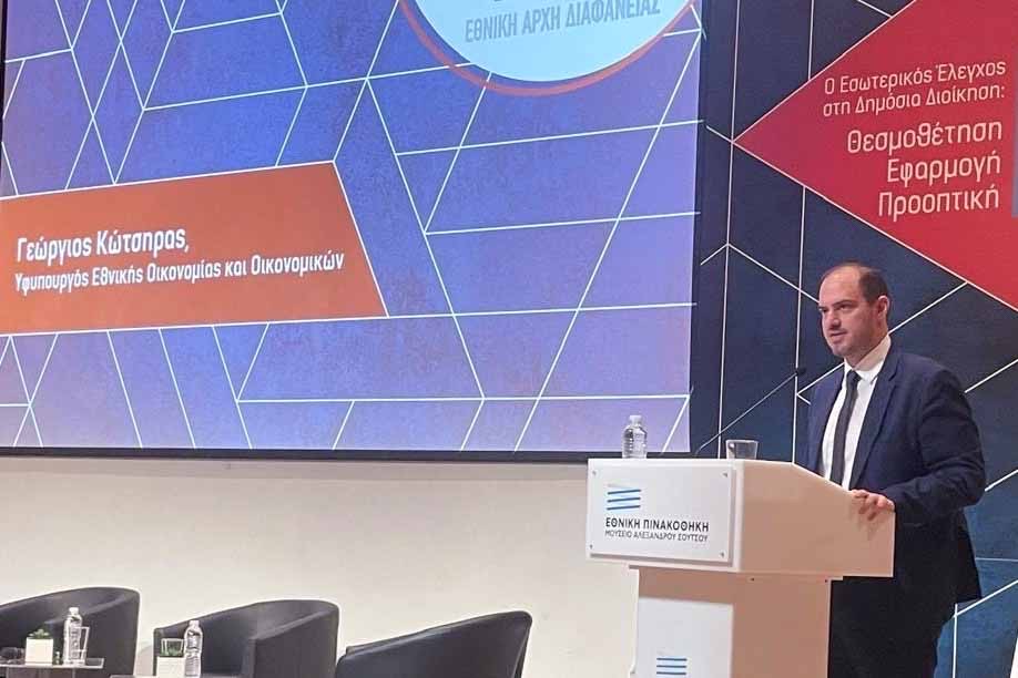 Τον ρόλο του εσωτερικού ελέγχου στη δημοσιονομική υπευθυνότητα και στην ενίσχυση της φορολογικής δικαιοσύνης ανέδειξε ο Υφυπουργός Εθνικής Οικονομίας και Οικονομικών, Γιώργος Κώτσηρας, απευθύνοντας σήμερα Πέμπτη 26 Ιουνίου χαιρετισμό, και εκ μέρους του Υπουργού Κυριάκου Πιερρακάκη, σε ημερίδα της Εθνικής Αρχής Διαφάνειας, όπου παρουσιάστηκε η Έκθεση για την εφαρμογή του μέρους Α’ του ν. 4795/2021 για το Σύστημα Εσωτερικού Ελέγχου σε φορείς του Δημοσίου Τομέα.