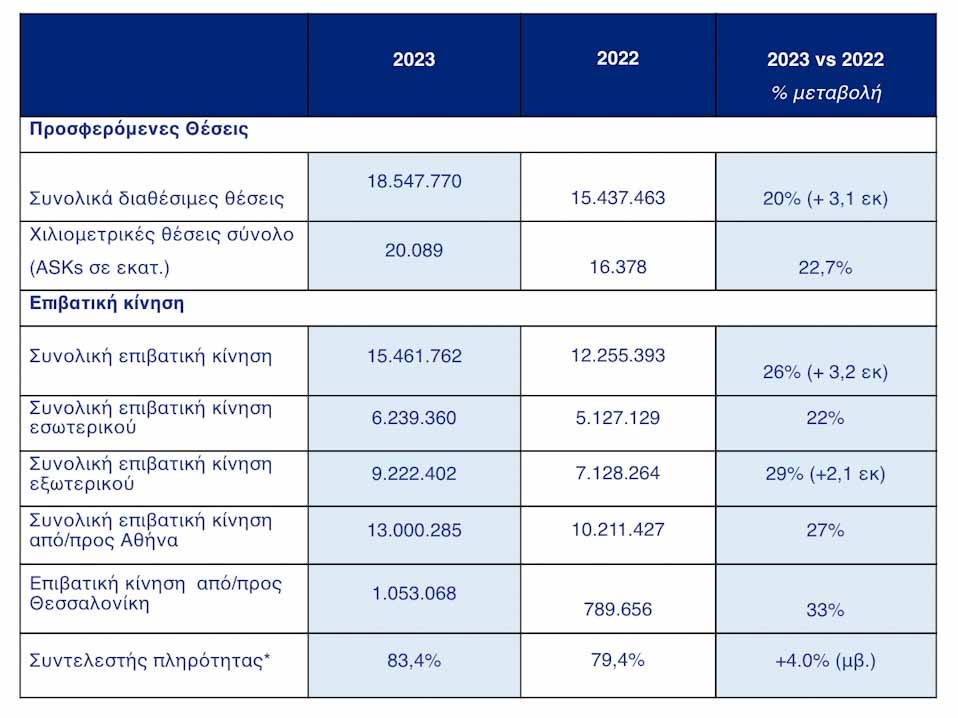 Μια ακόμη επιτυχημένη χρονιά δυναμικής ανάπτυξης ολοκληρώθηκε για την AEGEAN, η οποία προσέφερε 18,5 εκατομμύρια θέσεις το 2023, αυξημένες κατά 3,1 εκατ. συγκριτικά με το 2022, ενώ μετέφερε 15,5 εκατ. επιβάτες, αυξημένοι κατά 3,2 εκατ., επιτυγχάνοντας αύξηση της τάξεως του 26% σε σύγκριση με το προηγούμενο έτος, & καταγράφοντας νέο ιστορικό υψηλό.