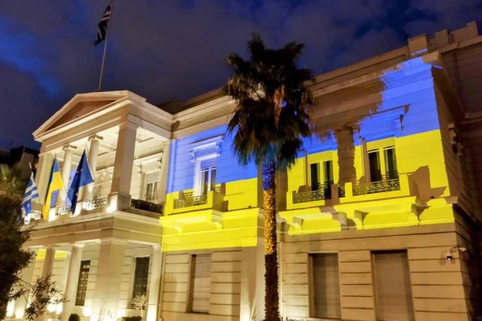 Σε ένδειξη αλληλεγγύης της Ελλάδας στην Ουκρανία και στον δοκιμαζόμενο από τη ρωσική εισβολή ουκρανικό λαό, φωταγωγήθηκε σήμερα το βράδυ το κτήριο του Υπουργείου Εξωτερικών.