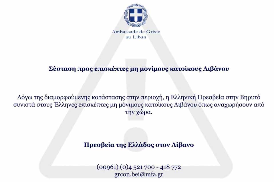 Όπως αναφέρεται σε ανακοίνωση που έχει αναρτηθεί στα ελληνικά και στα αγγλικά, «λόγω της διαμορφούμενης κατάστασης στην περιοχή, η Ελληνική Πρεσβεία στην Βηρυτό συνιστά στους Έλληνες επισκέπτες μη μόνιμους κατοίκους Λιβάνου όπως αναχωρήσουν από τη χώρα».