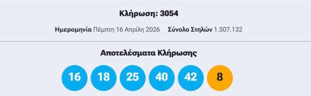 Πραγματοποιήθηκε το βράδυ της Πέμπτης (16/4) η κλήρωση 3054 του Τζόκερ που μοιράζει στην πρώτη κατηγορία πάνω από 5 εκατ. ευρώ.