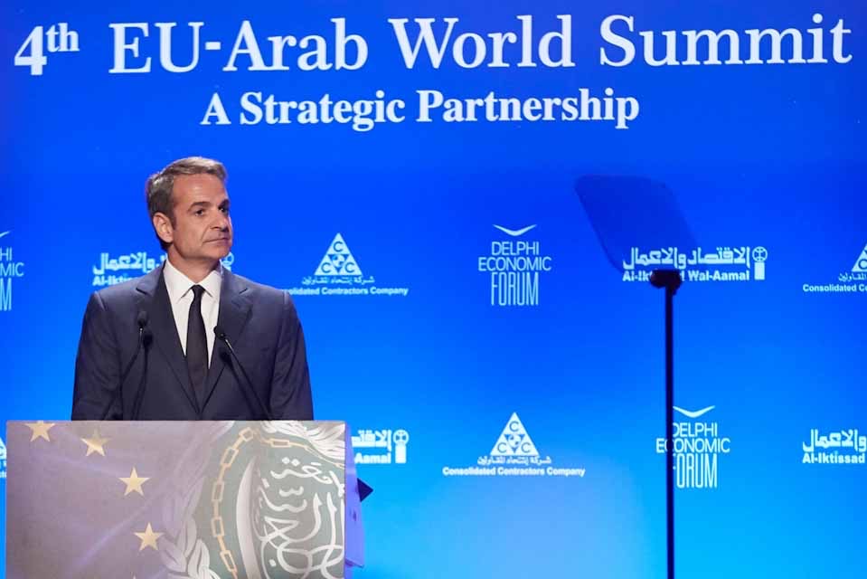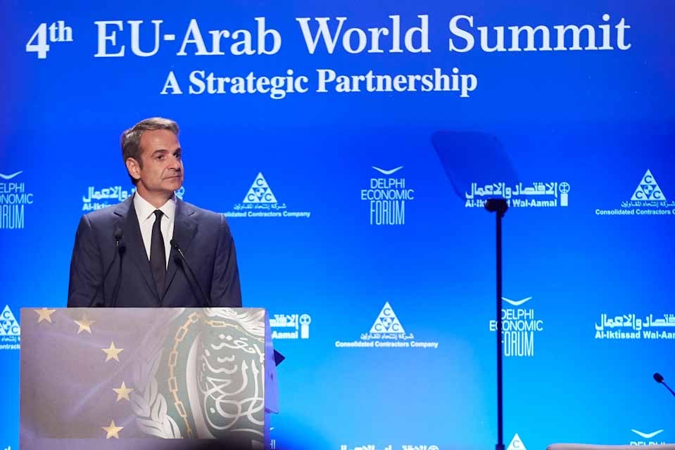 «Η χώρα μου δέχεται, ειδικά τους τελευταίους μήνες, ροές προσφύγων και μεταναστών, ασύμμετρες σε σχέση με την έκταση και τον πληθυσμό της. Τα ακριτικά μας νησιά ασφυκτιούν και περιοχές της ενδοχώρας με δομές φιλοξενίας αντιμετωπίζουν τα πρώτα προβλήματα», ανέφερε ο πρωθυπουργός, Κυριάκος Μητσοτάκης, κατά τη διάρκεια της ομιλίας του στην 4η Ευρω-αραβική Σύνοδο.