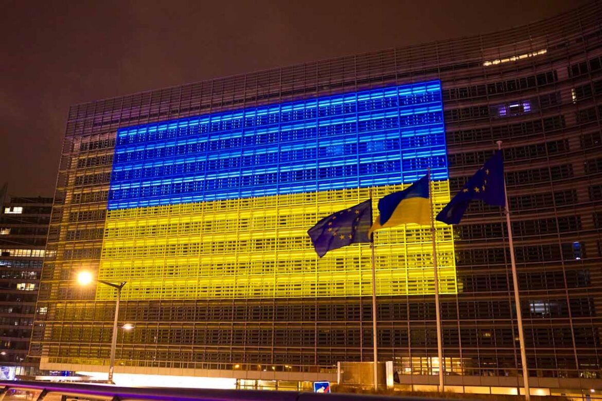 Παράλληλα, το κτίριο της Ευρωπαϊκής Επιτροπής φωταγωγήθηκε χθες, Δευτέρα, το βράδυ με τα χρώματα της ουκρανικής σημαίας.