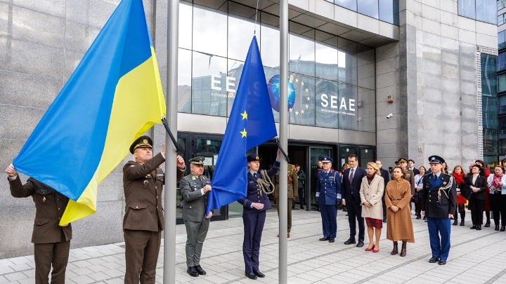 Σε ένδειξη αλληλεγγύης προς τον ουκρανικό λαό, η ουκρανική σημαία υψώθηκε σήμερα δίπλα στη σημαία της Ευρωπαϊκής Ένωσης μπροστά από την έδρα της Ευρωπαϊκής Υπηρεσίας Εξωτερικής Δράσης (ΕΥΕΔ, EEAS), κατά τη διάρκεια σύντομης τελετής παρουσία της Ύπατης Εκπροσώπου της ΕΕ Κάγια Κάλας.