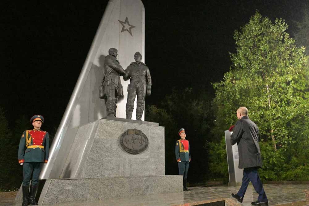 Ο Πούτιν στον δρόμο προς την Αλάσκα, επισκέφτηκε στο Μαγκαντάν, μνημείο που απεικονίζει την χειραψία Σοβιετικών και Αμερικανών πιλότων με φόντο το φτερό ενός αεροσκάφους, αποδίδει φόρο τιμής στην αεροπορική σύνδεση Αλάσκας-Σιβηρίας, η οποία προώθησε περίπου 8.000 πολεμικά αεροσκάφη Lend-Lease των ΗΠΑ στο σοβιετικό μέτωπο μεταξύ 1942 και 1945.